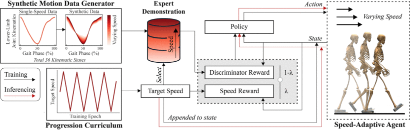How can human gait data and physics-informed simulation be used to build a personalized exoskeleton–human model for training adaptive walking assistance?